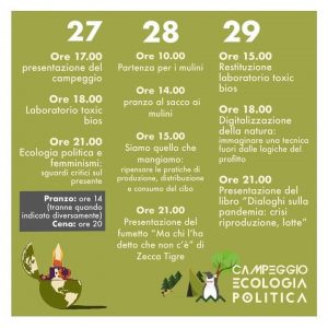 Il 1° campeggio di Ecologia Politica, svoltosi nel 2020, è stato per noi un importante momento di scambio e confronto: tra i diversi nodi di ecologia politica, sparsi su tutto il territorio italiano, e con tutti coloro che hanno voluto provare a declinare il paradigma dell’Ecologia Politica nelle pratiche di lotta e resistenza.
