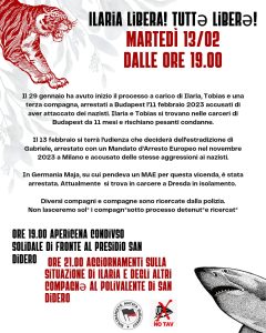 Il 29 gennaio è iniziato il processo a carico di Ilaria, Tobias e una terza compagna, arrestati a Budapest l’11 febbraio 2023 accusati di aver attaccato dei Nazisti. Ilaria e Tobias si trovano nelle carceri ungheresi da ormai un anno.