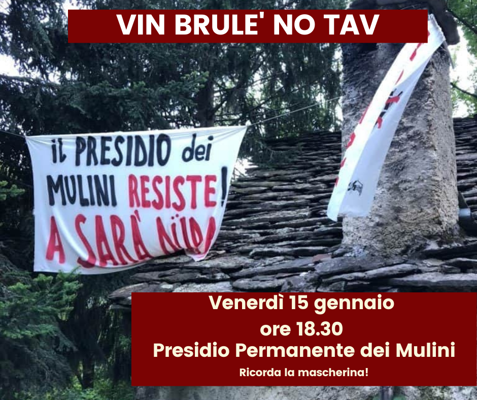 Ci ritroveremo venerdì 15 gennaio dalle ore 18.30, al Presidio Permanente dei Mulini per condividere un caldo vin brulé e discutere insieme sui danni provocati dall’allargamento del cantiere Tav Torino-Lione, organizzato da Telt che senza problemi continua a devastare ettari di bosco in Val Clarea.