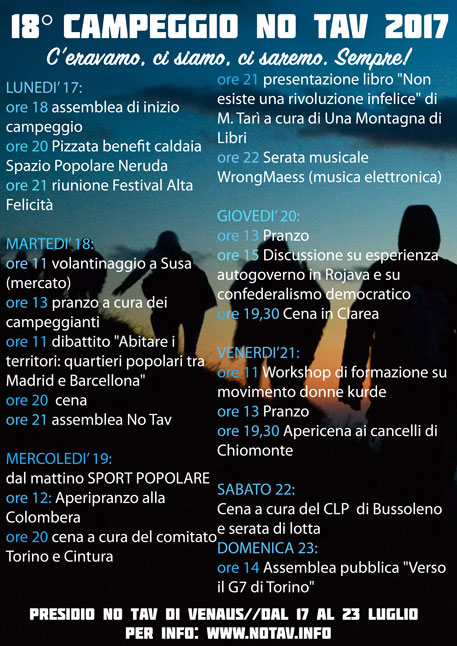 Read more ›Inizia lunedì 17 luglio il campeggio di lotta No Tav a Venaus che durerà fino a domenica 23 luglio. Come tutti gli anni ci ritroviamo nella valle che Resiste per […]