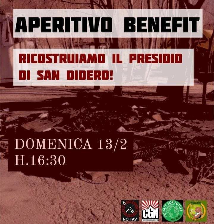 Dopo l’infame tentativo di intimidazione di martedì notte, in cui è stata incendiata la casetta del presidio di San Didero, noi, come realtà giovanili della valle, vogliamo fare la nostra parte per la ricostruzione del punto informativo, e vogliamo dimostrare che non sarà questo a fermarci! Perciò ci vedremo domenica per un aperitivo proprio sul luogo dell’incendio, e tutto il ricavato andrà verso la ricostruzione del punto informativo. Venite in tant*, con tanta presa bene e voglia di socialità. Vi aspettiamo numeros*!