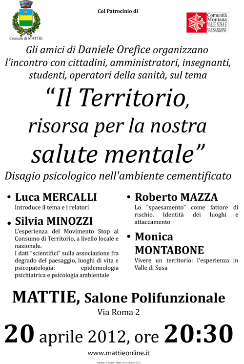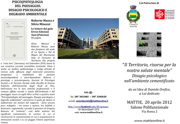 La dott.ssa Minozzi illustrerà i dati scientifici del rapporto fra degrado del paesaggio, luoghi di vita e patologie psichiche, mentre lo il Dott. Mazza tratterà dello “spaesamento” come fattore di rischio legato all’identità dei luoghi e all’attaccamento ad essi.