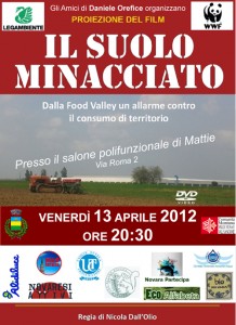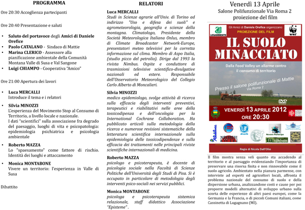 Per introdurre il tema, venerdì 13 aprile alle ore 20:30 presso il salone polifunzionale di Mattie, è prevista la proiezione del Film “Il suolo minacciato”, prodotto da WWF e Legambiente di Parma, con la regia di Nicola Dall’Olio, già vincitore del Valsusa Filmfest sezione documentari l’anno scorso.