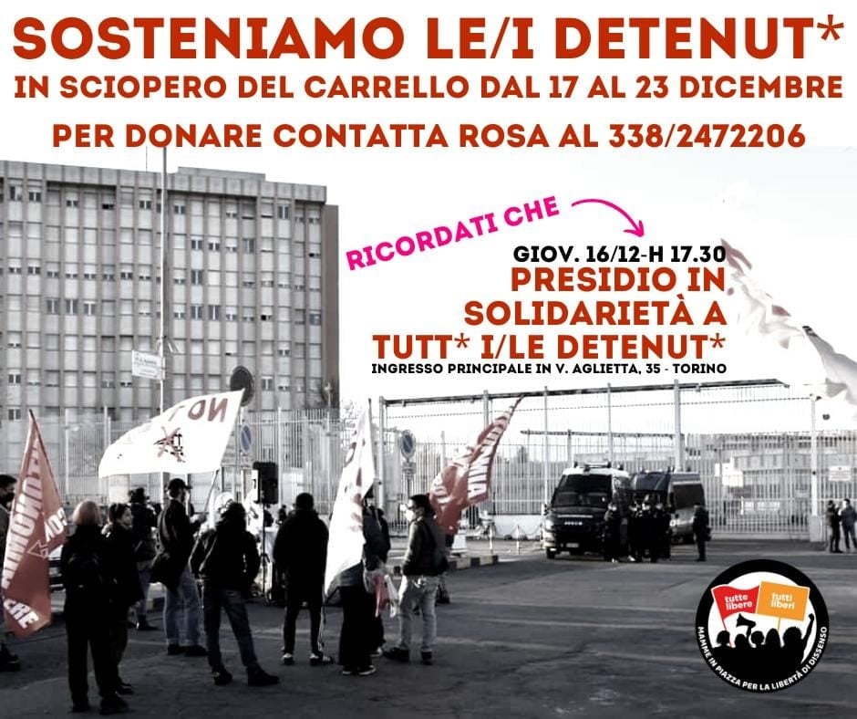 Giovedì 16/12 le Mamme in piazza per la libertà di dissenso saranno di nuovo sotto le mura del penitenziario Torinese per portare la solidarietà a questa nuova forma di protesta portata avanti dalle detenute, e invitano tutte e tutti a partecipare ad una raccolta fondi per sostenere le persone detenute durante lo sciopero del carrello, che le vedrà costrette ad acquistare gli alimenti attraverso il sopravvitto, la spesa esterna al carcere, che ha dei costi elevati rispetto a quanto gli stessi prodotti si possano trovare in commercio nei normali supermercati.