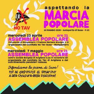 In preparazione della marcia popolare del 10 maggio a Susa per dire un forte e compatto No al deposito di smarino e alla chiusura della stazione ferroviaria, invitiamo tuttə a partecipare ai due momenti di assemblea previsti nei mesi di aprile e maggio.