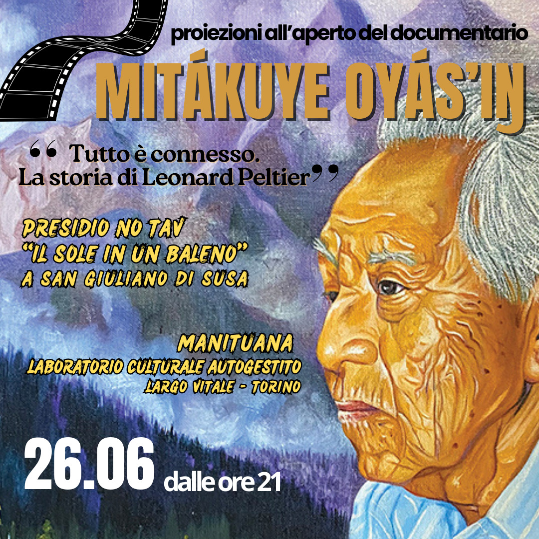 Mercoledì 26 giugno alle ore 21.30, presso il presidio NOTAV Sole e Baleno di Susa, sotto esproprio e in contemporanea al laboratorio autogestito Manituana di Torino, verrà proiettato il documentario “MITÁKUYE OYÁS’IŊ (Tutto è connesso)”.