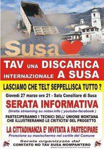 Il 27 marzo alle ore 21 si terrà presso la Sala Consiliare del Comune di Susa una serata informativa organizzata dal Comitato No TAV Susa-Mompantero.