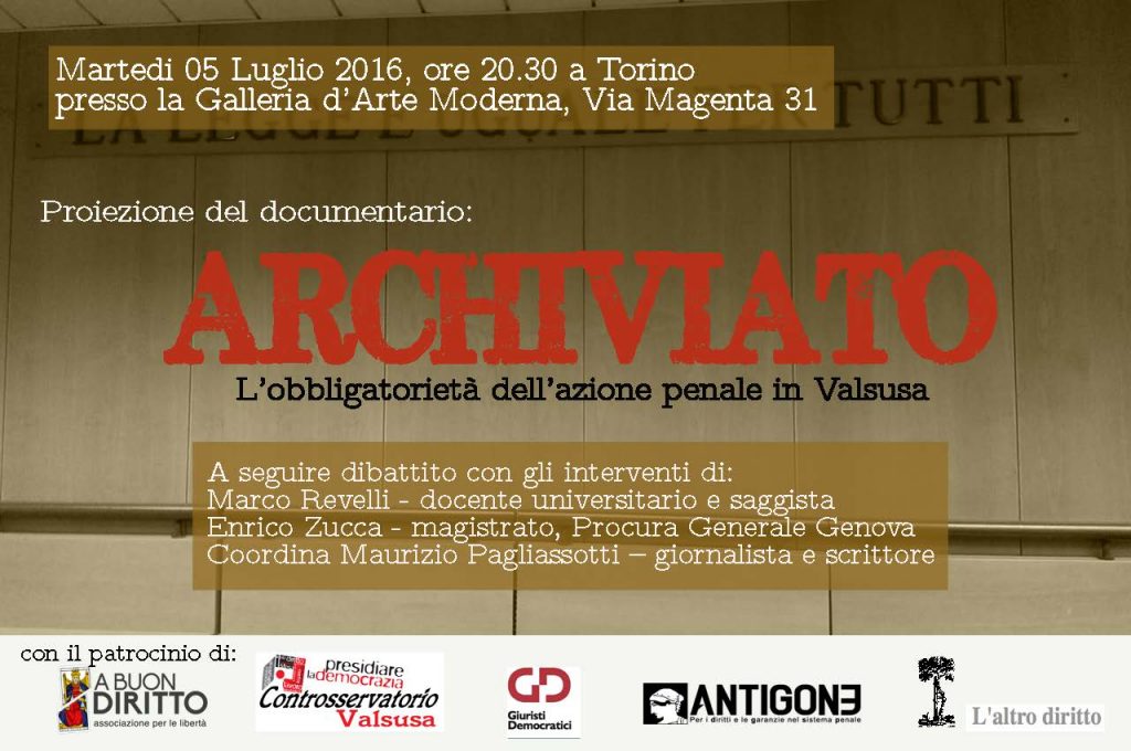 Martedì 5 luglio 2016, alle ore 20.30, presso la Galleria d’Arte Moderna di Torino, via Magenta n. 31, verrà proiettato il documentario “ARCHIVIATO. L’ obbligatorietà dell’azione penale”, con il patrocinio di:
