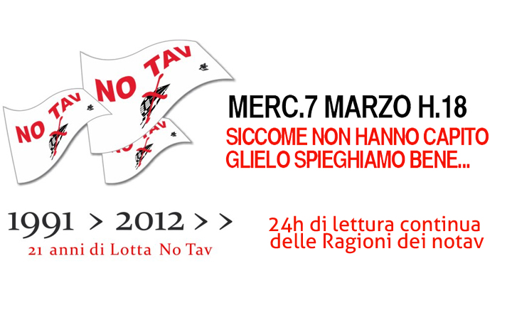 Da lì i no tav a turno leggeranno ininterrottamente per 24 ore le 150 ragioni contro l’alta velocità. Sarà una maratona di lettura, aperta a tutti, a cui tutti potranno partecipare con momenti per intrattenersi al riparo durante la notte.