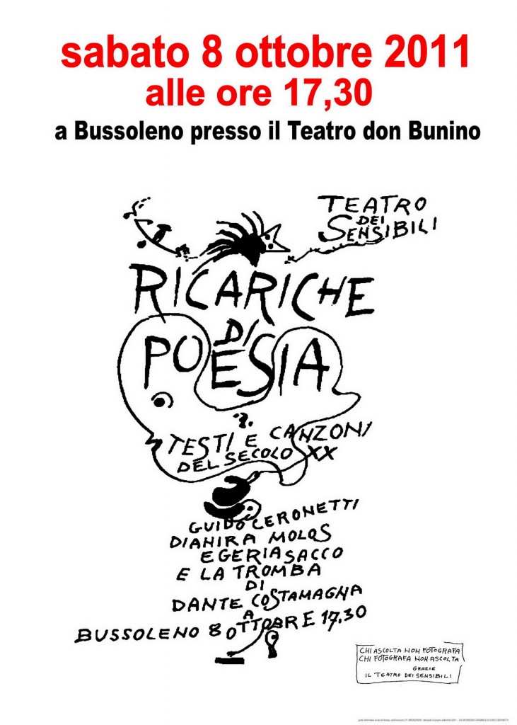 sabato pomeriggio 8 ottobre ore 17,30 a Bussoleno presso il Teatro don Bunino per lo spettacolo del Teatro dei sensibili di e con Guido Ceronetti “RICARICHE DI POESIA”.