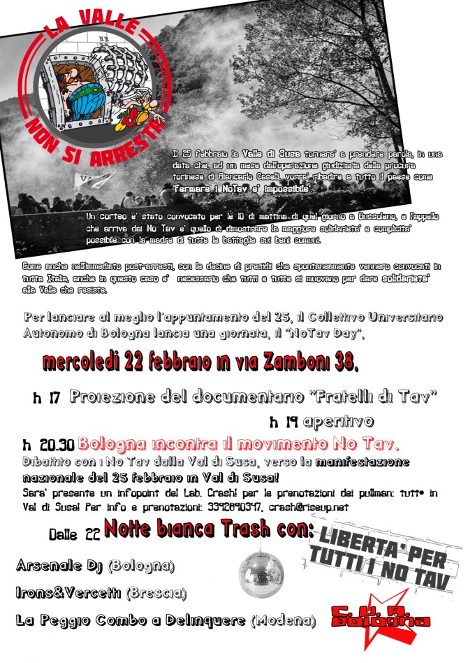 Per lanciare al meglio l’appuntamento del 25, il Collettivo Universitario Autonomo di Bologna lancia una giornata, il “NoTav Day”, mercoledì 22 febbraio in via Zamboni 38.
