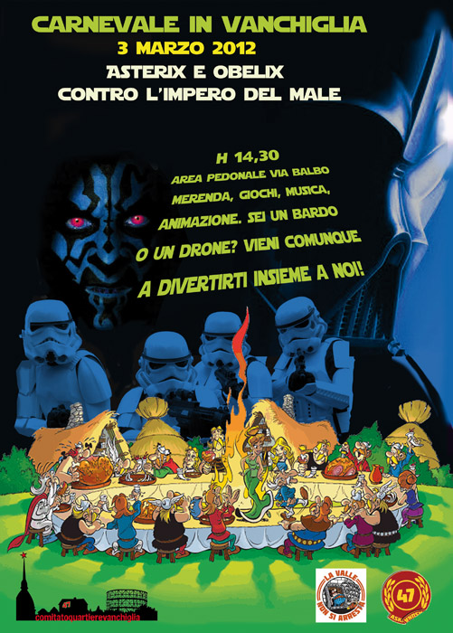 Il tema del carnevale 2012 è Asterix contro l’Impero del Male, con un chiaro rimando alla lotta No TAV, con la quale il comitato di quartiere Vanchiglia è, da sempre, solidale e partecipe.