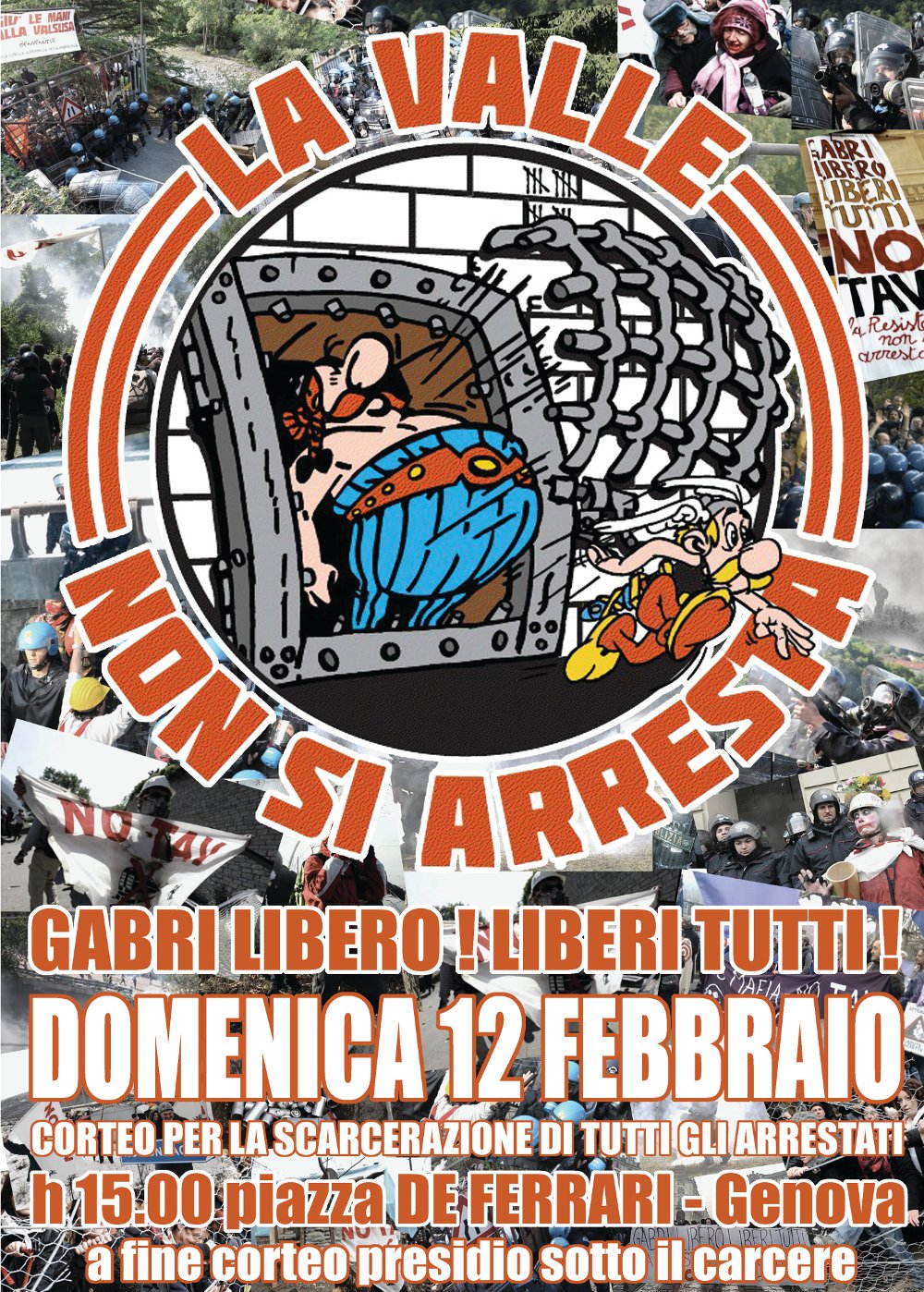 Sentiamo perciò la necessità di mobilitarci per far sentire la nostra vicinanza a Gabriele e a tutti gli arrestati e per raccontare a tutta la società civile cosa sta accadendo in Val di Susa e nel resto d’Italia. A tutti coloro che hanno a cuore il diritto di esprimere dissenso, di resistere e di difendere il territorio e i beni comuni chiediamo di scendere in piazza con noi domenica 12 febbraio, per un corteo che chieda l’immediata scarcerazione di tutti i NO TAV, portando sotto il carcere di Marassi un po’ di musica e un nostro abbraccio a Gabriele.