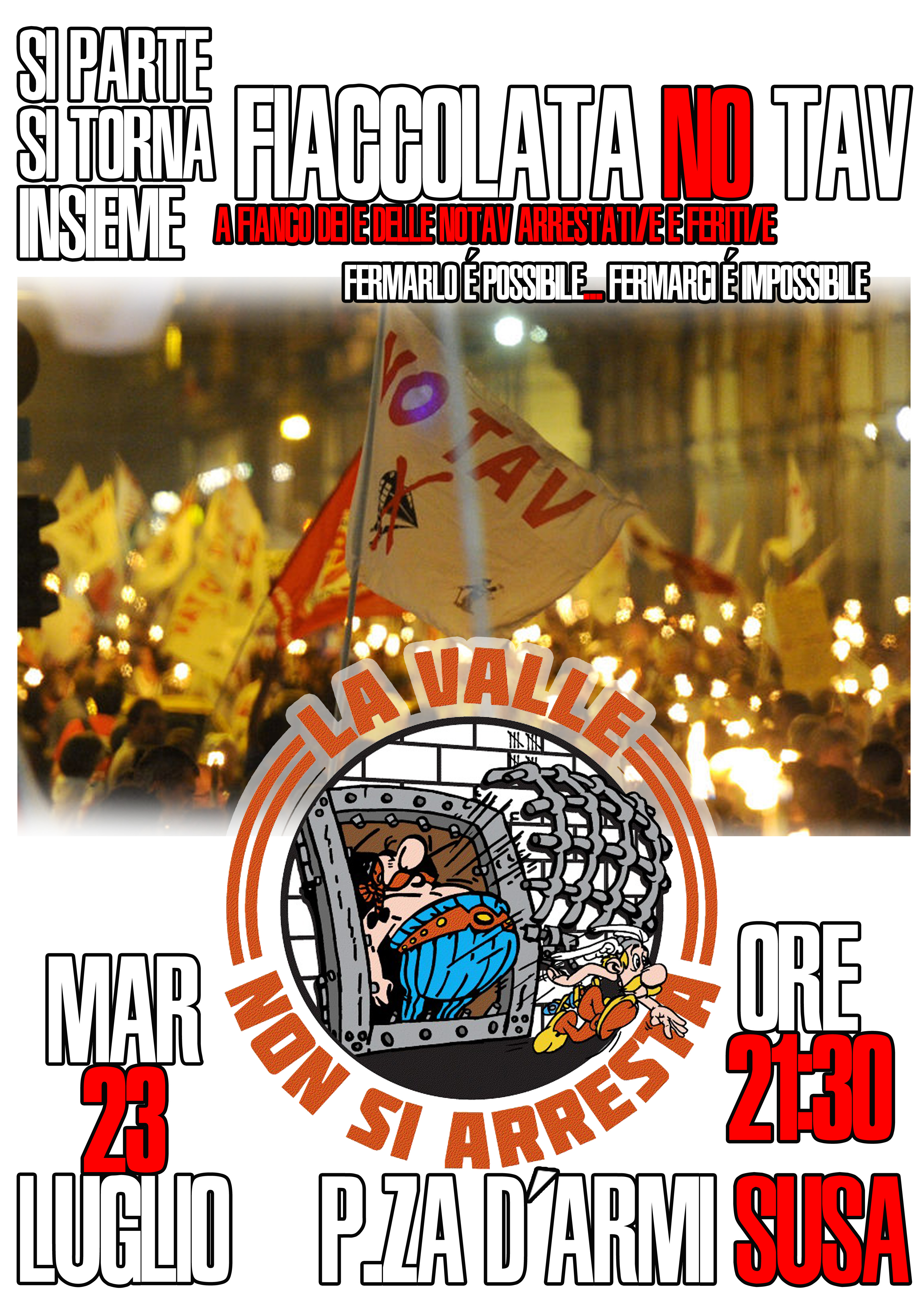 Martedì 23 luglio il Movimento No Tav organizza una fiaccolata in solidarietà agli arrestati e a tutti i feriti dalla violenza delle forze dell’ordine di venerdì notte. Appuntamento ore 21,30 in Piazza d’Armi a Susa. Portare bandiere No Tav!