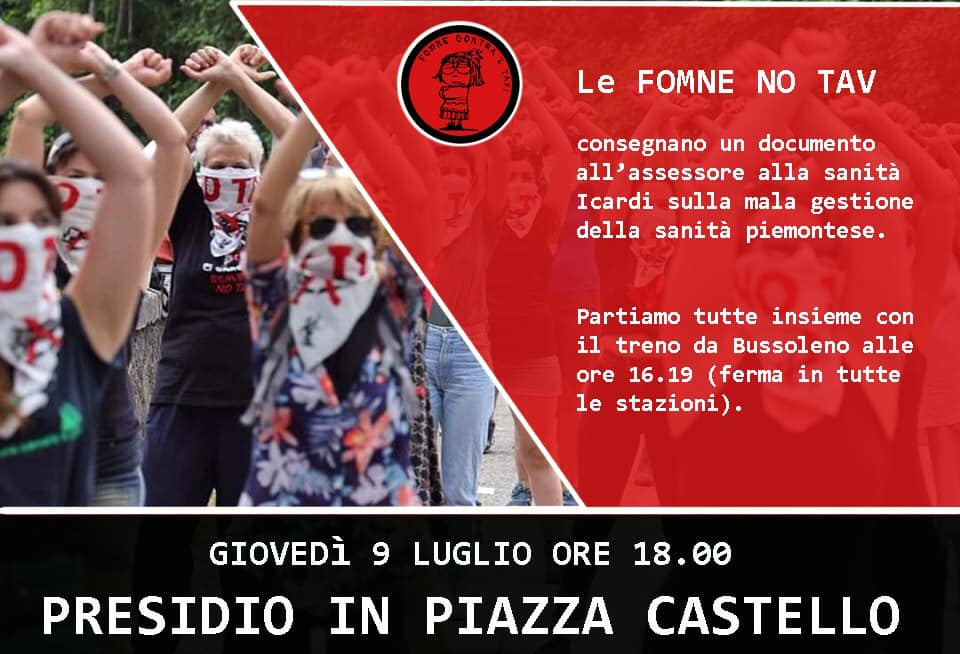 Il 9 luglio alle ore 18 le Fumne No Tav, saranno in piazza Castello a Torino per una manifestazione statica, nel rispetto delle norme, per ricordare agli amministratori regionali quanto sia stato alto, e probabilmente lo sarà anche in futuro, il prezzo pagato da tutti i cittadini e dalle donne in particolare a seguito delle politiche sanitarie portate avanti dai governi nazionali e regionali.