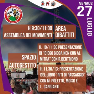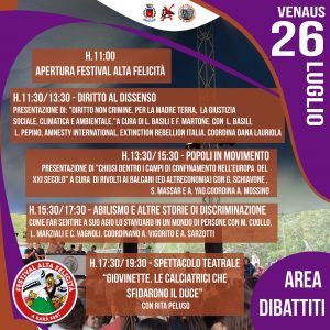Anche quest’anno, attraverso i tanti momenti di incontro e dibattito che si succederanno nei tre giorni del Festival Alta Felicità, cercheremo di fare questo. Oltre all’area concerti, infatti, al Festival ci saranno due diverse aree destinate a dibattiti ed assemblee: l’Area Dibattiti e lo Spazio Atuogestito!