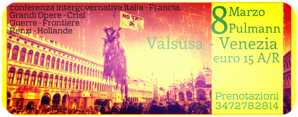 Stiamo organizzando questo lungo viaggio che ci porterà ancora una volta verso i palazzi e le città dove vengono prese le decisioni sul futuro della nostra valle e del progetto tav Torino – Lione. Questa volta la “gita” è a Venezia, l’8 marzo, una data importante in una bellissima città. L’entusiasmo come sempre è tanto e prima di un viaggio così facciamo appello a tutti i no tav, a mettersi in marcia, a raggiungere insieme questa meta. Come sempre si parte e si torna insieme… anche in pullman!