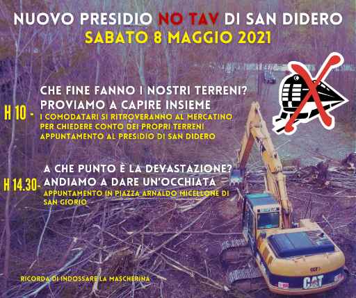 Sabato 8 maggio, il Nuovo Presidio di San Didero si animerà nuovamente di due iniziative volte alla conoscenza del territorio che Telt & Co. senza nessun tipo di remora hanno iniziato a devastare e violentare nelle scorse settimane: