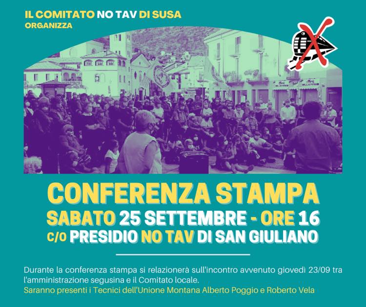 Di questo incontro si parlerà nella conferenza stampa indetta per sabato 25 settembre alle ore 16.00 presso il Presidio di San Giuliano a Susa. Alla conferenza saranno presenti i tecnici designati dall’Unione Montana, Ing. Alberto Poggio e Ing. Roberto Vela.