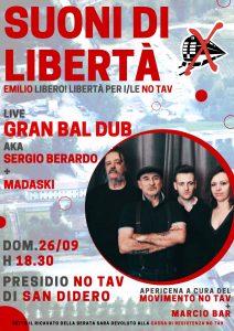 Domenica 26 settembre, dalle ore 18.30, ci ritroveremo al Presidio No Tav di San Didero per il concerto “Suoni di Libertà” insieme ai Gran Bal Dub.