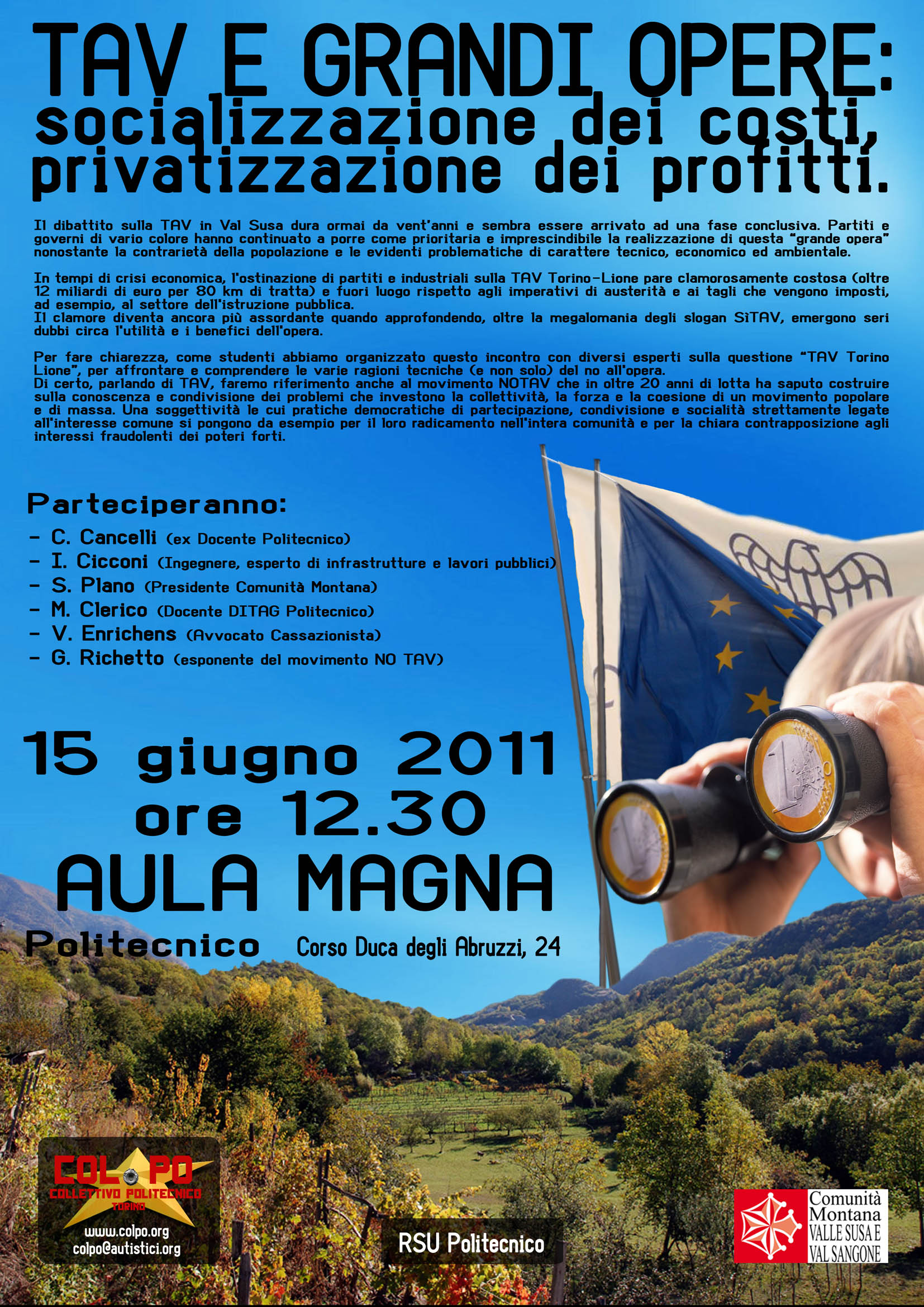 Di certo, parlando di TAV, faremo riferimento anche al movimento NOTAV che in oltre 20 anni di lotta ha saputo costruire sulla conoscenza e condivisione dei problemi che investono la collettività, la forza e la coesione di un movimento popolare e di massa. Una soggettività le cui pratiche democratiche di partecipazione, condivisione e socialità strettamente legate all’interesse comune si pongono da esempio per il loro radicamento nell’intera comunità e per la chiara contrapposizione agli interessi fraudolenti dei poteri forti.