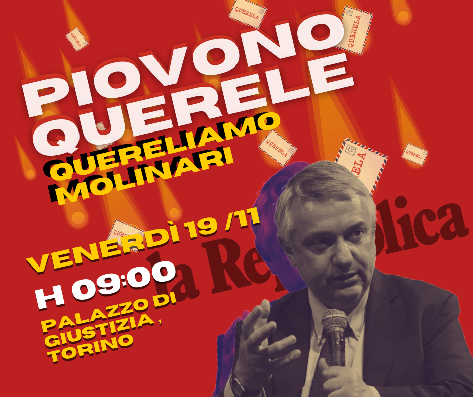 Venerdì 19 novembre, alle ore 9, ci ritroveremo davanti al Tribunale di Torino, per l’iniziativa “Una pioggia di Querele su Molinari”. Tutte e tutti insieme andremo a depositare le prime querele contro le diffamatorie dichiarazioni fatte da Maurizio Molinari, Direttore de “La Repubblica”, all’interno della trasmissione televisiva “Mezz’ora in più”, diretta da Lucia Annunziata, lo scorso 10 ottobre.