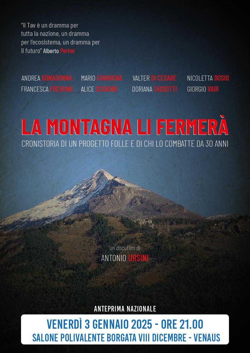 ” ‘La montagna li fermerà’ parte dai fatti della notte del 6 ottobre 2024, l’esproprio illegale e violento di un fazzoletto di terra dove sorgeva uno degli storici presidi del movimento No Tav, e ripercorre attraverso la testimonianza di donne e uomini della Valle, la storia lunga trent’anni di opposizione al progetto folle e dannoso del Tav.