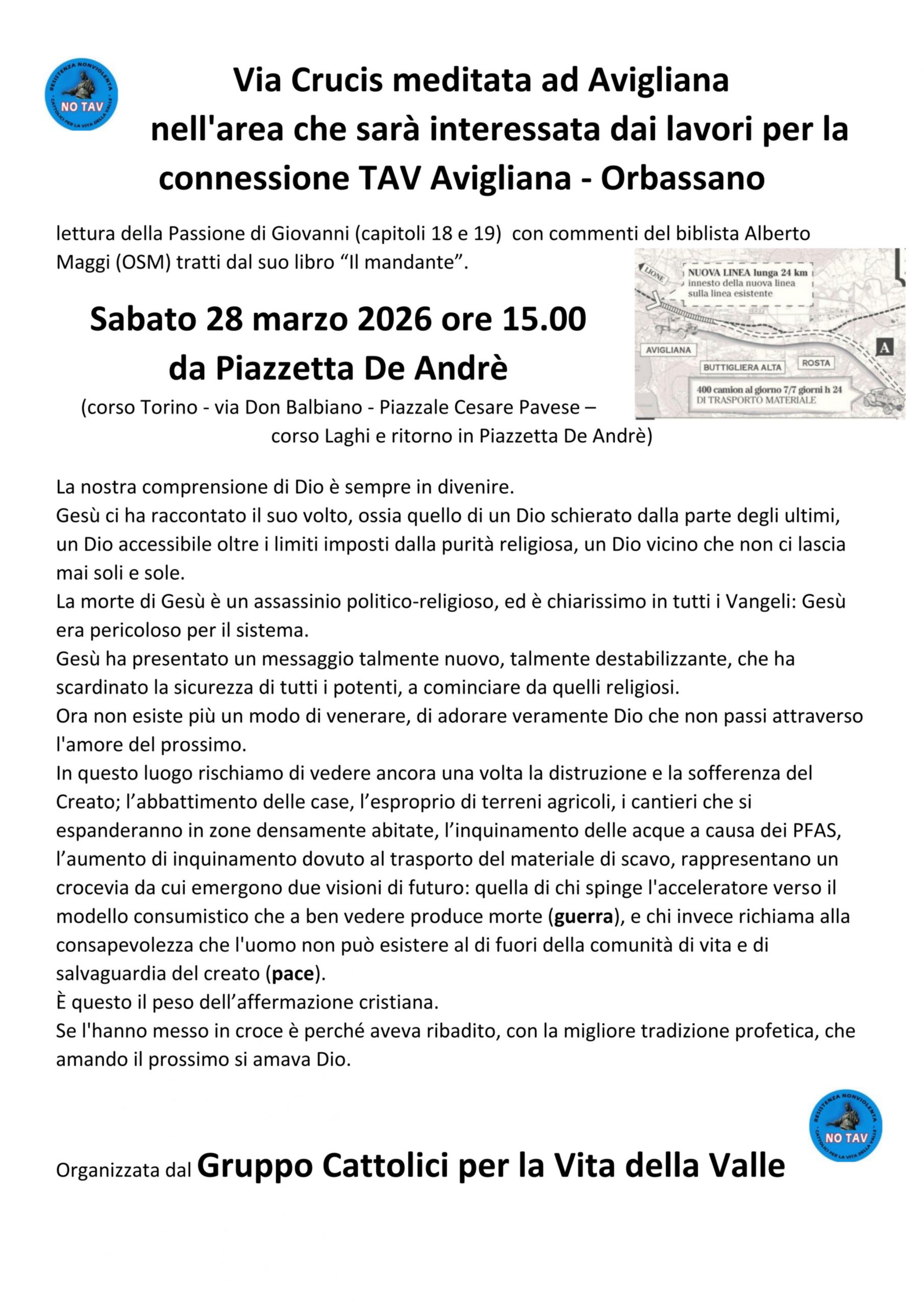 In questo luogo rischiamo di vedere ancora una volta la distruzione e la sofferenza del Creato; l’abbattimento delle case, l’esproprio di terreni agricoli, i cantieri che si espanderanno in zone densamente abitate, l’inquinamento delle acque a causa dei PFAS, l’aumento di inquinamento dovuto al trasporto del materiale di scavo, rappresentano un crocevia da cui emergono due visioni di futuro: quella di chi spinge l’acceleratore verso il modello consumistico che a ben vedere produce morte (guerra), e chi invece richiama alla consapevolezza che l’uomo non può esistere al di fuori della comunità di vita e di salvaguardia del creato (pace).