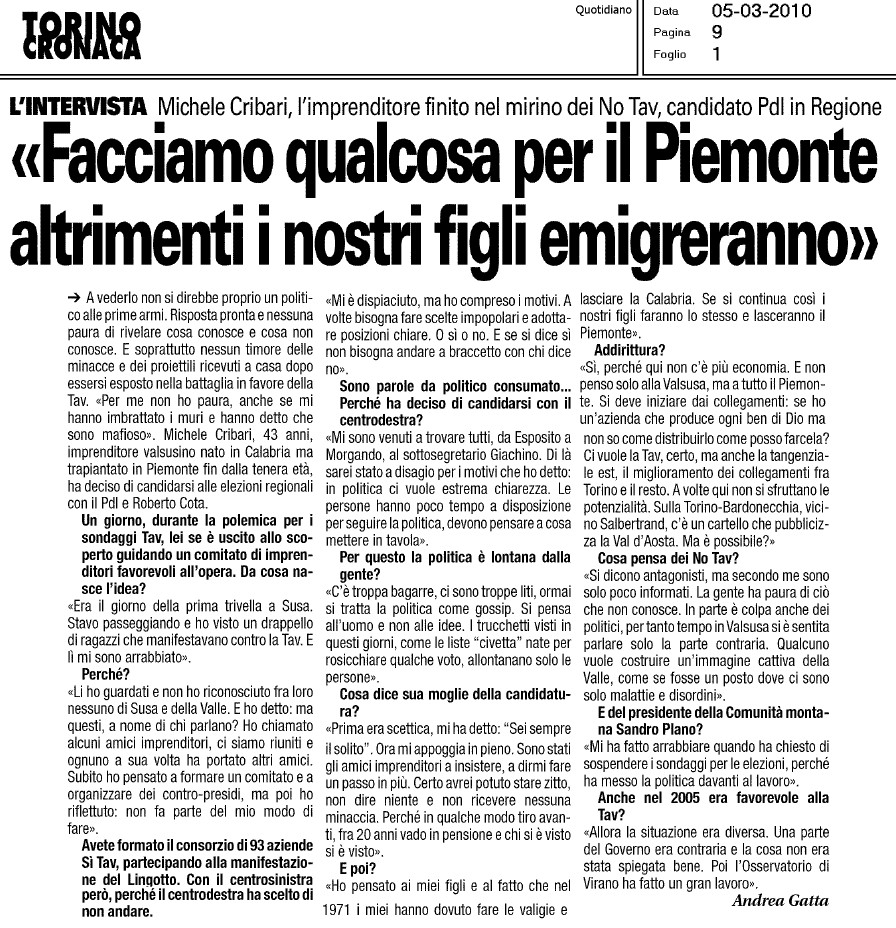Read more ›da Cronaca qui Michele Cribari, l’imprenditore finito nel mirino dei No Tav, candidato Pdl in Regione «Facciamo qualcosa per il Piemonte altrimenti i nostri figli emigreranno» A vederlo non si […]
