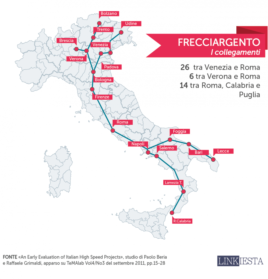 «I dati disponibili specifici sulle linee ad Alta velocità sono di due tipi: l’orario e alcuni comunicati stampa con dati estremamente aggregati. Ferrovie dello Stato dichiara che circa 20 milioni di biglietti sono stati venduti nel 2010 per servizi ad Alta Velocità, tutti sui treni Frecciarossa e Frecciargento. Non sono disponibili dati sulla distanza media dei viaggi. Inoltre alcuni quotidiani nazionali hanno riferito che 3 milioni di passeggeri hanno viaggiato sulla linea Milano-Roma (ItaliaOggi, 2010), che però non includono i viaggi che terminano nelle fermate intermedie di Bologna e Firenze. Un recente documento (Cascetta et aliis, 2011) fornisce dati molto disaggregati sul collegamento Roma-Napoli, riportando 1,4 milioni di passeggeri. Tali dati tuttavia si riferiscono al 2007. L’Alta velocità ha preso servizio nel 2006, ma le infrastrutture non sono state completate con la penetrazione urbana fino al 2009, così il tempo guadagnato era limitato (1 h 27 min contro 1h 10 oggi). Oggi i viaggiatori dovrebbero dunque essere aumentati.