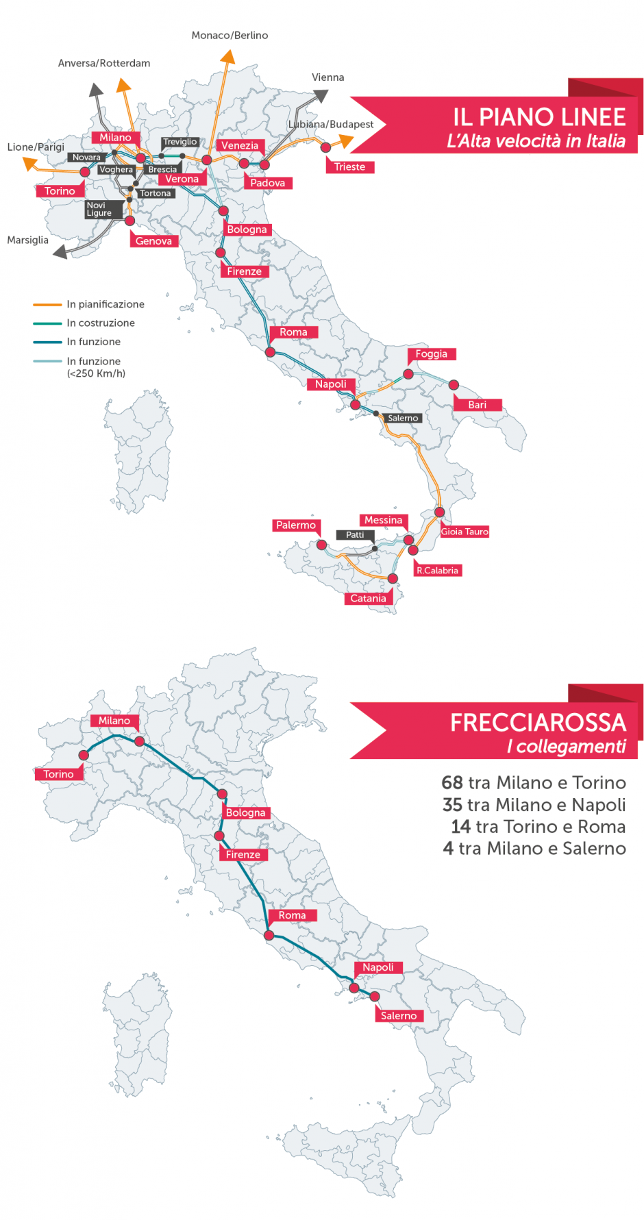 Le linee in funzione, da Torino alla Napoli-Salerno, sono il cuore del traffico a lunga distanza italiano, perché collegano le più importanti aree urbane (ad eccezione della linea Ovest-Est da Torino a Venezia).
