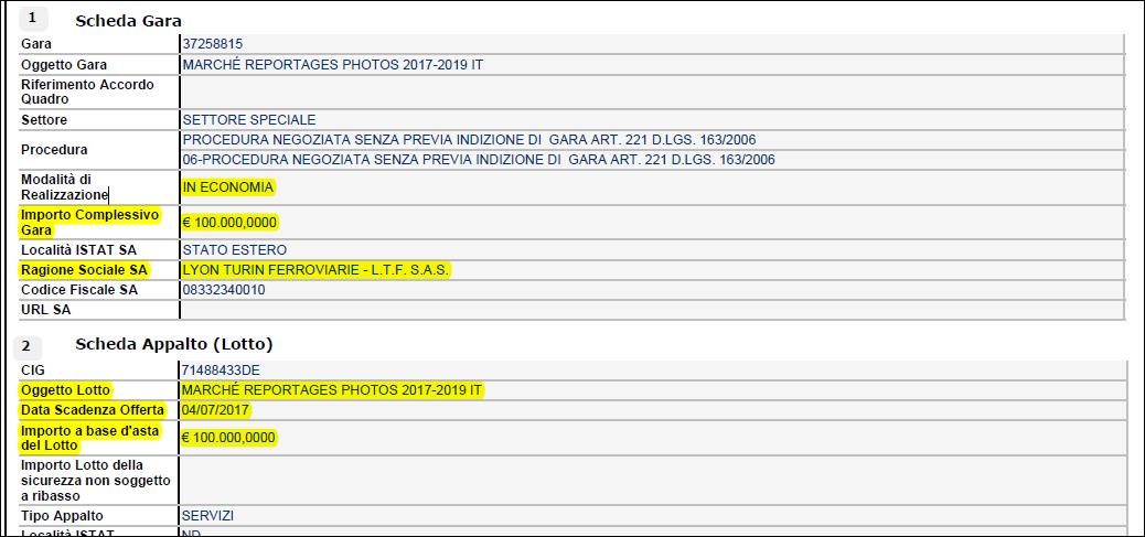 Poi la scheda ci dice che c’è stato un appalto per un reportage fotografico, che l’appalto è stato realizzato in economia, che l’importo complessivo della gara era di 100.000 euro, che la gara era negoziata ma senza indizione di gara (quindi ad affidamento diretto), che la scadenza per effettuare le offerte era il 4 luglio 2017, che l’importo a base d’asta (che non c’è stata) era di 100.000 euro. Quindi il risultato, come prevedibile è stato: