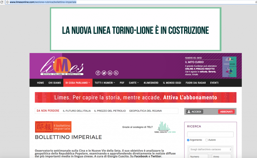 Su Limes, apprezzata rivista italiana di Geopolitica, è spuntata una marchetta colossale mascherata da sezione del sito: è nato Il Bollettino Imperiale che si presenta come l’osservatorio di Limes dedicato all’analisi geopolitica della Cina e alle nuove vie della seta. Una sezione il cui “obiettivo è analizzare la geopolitica della Repubblica Popolare, esaminando e approfondendo direttamente le notizie diffuse dai più importanti media in lingua cinese.” Molto interessante, peccato che se visitate la sezione apposita scoprirete subito che tutto nasce “Grazie al sostegno di TELT” e la pagina è un tripudio di banner sul Tav e sulle balle da marketing che ci raccontano da anni, compresa la via della seta, la nuova mossa comunicativa del sistema tav per ricostruire un immaginario comunicativo intorno al tav al fine di dimostrare che, siccome il famoso corridoio 5 è morto da tempo, oggi la linea collegherebbe la Cina con l’Europa passando per la Val Susa.