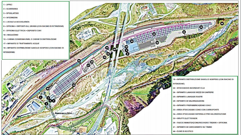 – la realizzazione a Susa di diversi cantieri: quello per l’imbocco est del tunnel di base, di circa 50.000 metri quadrati; l’area di lavoro “Susa Autoporto”, per la realizzazione delle opere a cielo aperto, che occuperà circa 130.000 metri quadrati; il cantiere dell’imbocco Ovest del tunnel di interconnessione, di circa 100.000 metri quadrati e finalizzato allo scavo delle due canne del tunnel di interconnessione fra Susa e Bussoleno. Il peso del materiale scavato per quest’ultimo tunnel ammonta a circa 1.400.000 tonnellate, parte di questo materiale verrà riutilizzato sul posto e parte mandato, tramite tir, a Salbertrand;