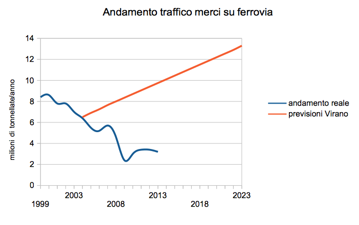 Nel 2004 le tonnellate trasportate erano 6,5 milioni, Virano prevedeva cha al 2023 sarebbero state13,3, al 2013 sono 3,2!