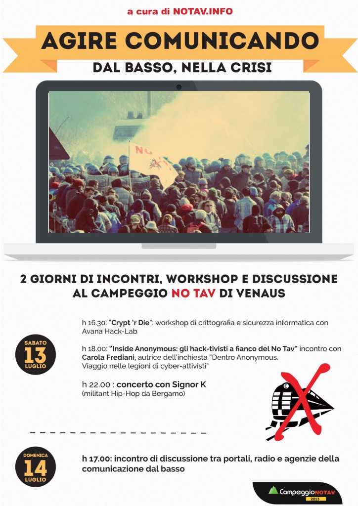 h 18.30: “Inside Anonymous: gli hack-tivisti a fianco del No Tav” incontro con Carola Frediani, autrice dell’inchiesta “Dentro Anonymous. Viaggio nelle legioni di cyber-attivisti”