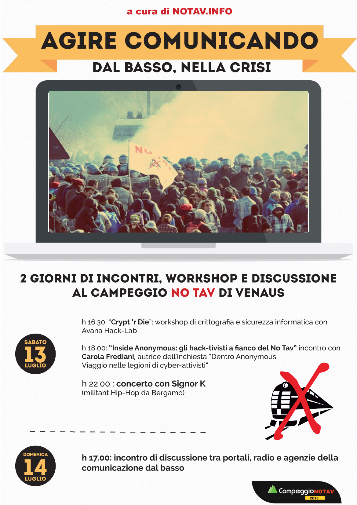 A partire da questi brevi spunti introduttivi la redazione di notav.info invita i soggetti e le agenzie della comunicazione dal basso a partecipare ad una due giorni di assemblea e confronto, che si terrà al campeggio di lotta allestito dal movimento No Tav a Venaus. Vi chiediamo di portare il vostro contributo, raccontare le vostre esperienze, fare il bilancio di una campagna di cui siete stati protagonisti, ragionare sui limiti e le ricchezze del nostro agire comunicativo, porre interrogativi; il tutto per arricchire una discussione collettiva e ad alta voce (l’invio di documenti, l’allestimento di banchetti e l’esposizione di materiali prodotti è vivamente consigliato).