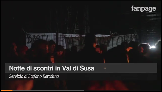 youmedia.fanpage.it di Stefano Bertolino. La passeggiata notturna del movimento NoTav si ferma alle reti poste dalle forze dell’ordine sul sentiero che porta al cantiere di Chiomonte. Intorno a mezzanotte i primi scontri con fuochi d’artificio e petardi sparati dai NoTav verso la polizia che ha risposto con un fitto lancio di lacrimogeni.