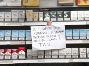 Singolare protesta di un tabaccaio in via Santa Gilla. Ha affisso un cartello rivolto ai fumatori che si lamentano per il rincaro del prezzo del tabacco: «Le sigarette sono aumentate, vi stanno facendo pagare in anticipo crisi e Tav».