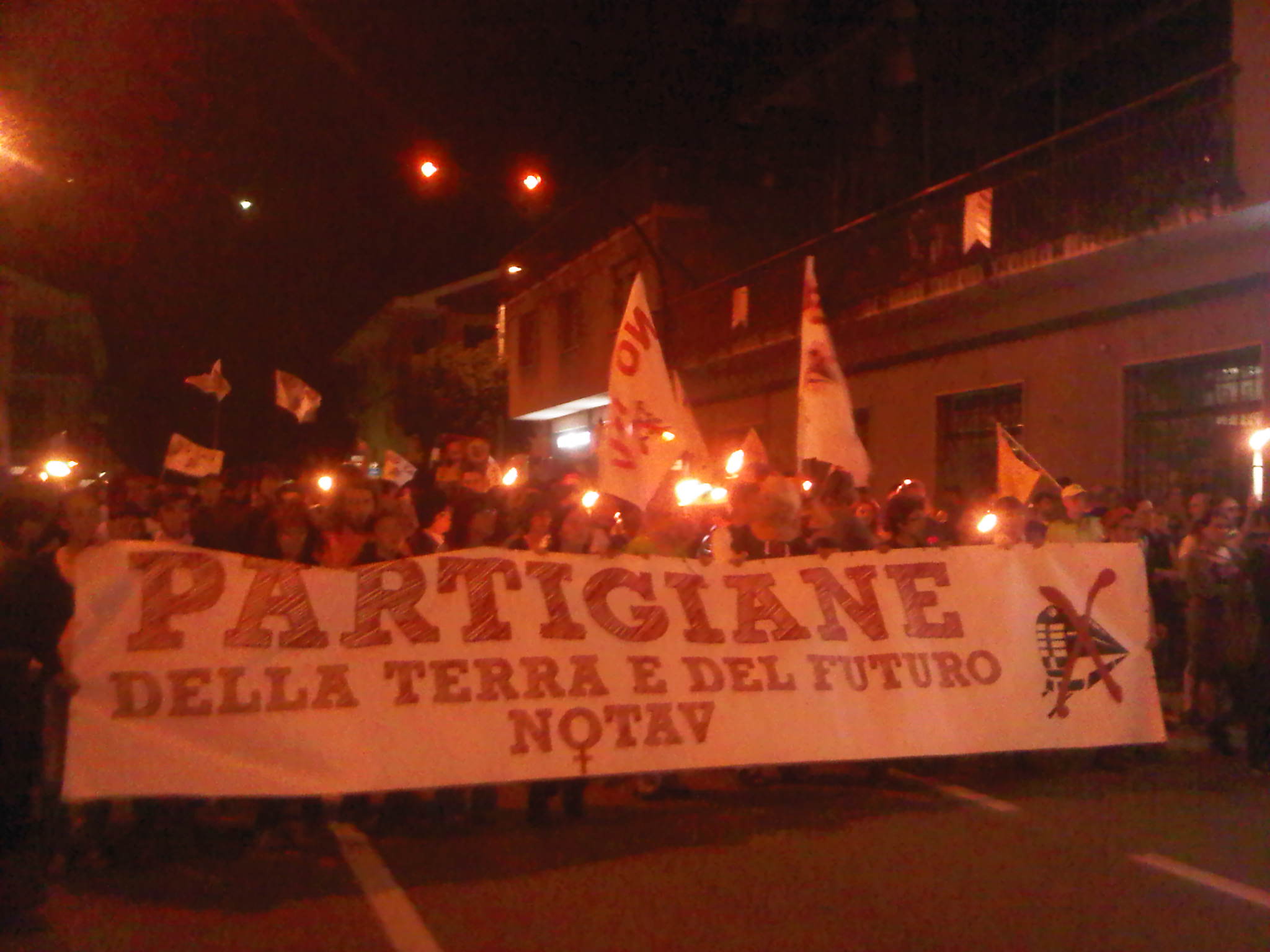 da infoaut.org- Circa 2mila persone hanno preso parte, sotto una pioggia debole, alla fiaccolata convocata per stasera in solidarietà con i notav arrestati e con chi quella notte fu vittima di pestaggi da parte delle forze dell’ordine durante la notte di venerdì scorso. Il corteo che ha attraversato le vie centrali della città di Susa è stato aperto con uno striscione atto a denunciare il comportamento delle forze dell’ordine che ha torturato e picchiato senza alcuna remora i molti notav che durante quella sera hanno preso parte alla passeggiata notturna. Un altro striscione a seguire che ha rimarcato la resistenza di tutte le donne dentro la lotta notav. In particolare è stato chiaro il riferimento alle violenze perpetrate ai danni di Marta, l’attivista pisana che oltre ad essere massacrata selvaggiamente, è stata vittima di abusi all’interno del cantiere. Molte le donne in prima fila che hanno voluto quindi dimostrare la propria vicinanza a Marta e dimostrare un protagonismo attivo all’interno della lotta NoTav.