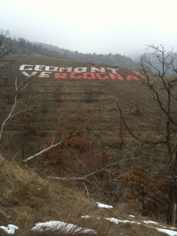 Oggi abbiamo realizzato una scritta sulla costa della montagna di Bussoleno per rendere pubblico il nome e la dita di chi lavora per il tav e vive in Valle. Con questo gesto crediamo importante evidenziare come ognuno si debba assumere le proprie responsabilità in merito alle scelte che compie. Chi vende la valle e si vende per quattro denari al Tav deve essere conosciuto da tutti ed isolato.