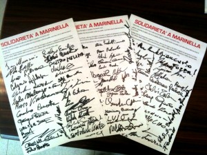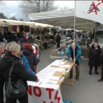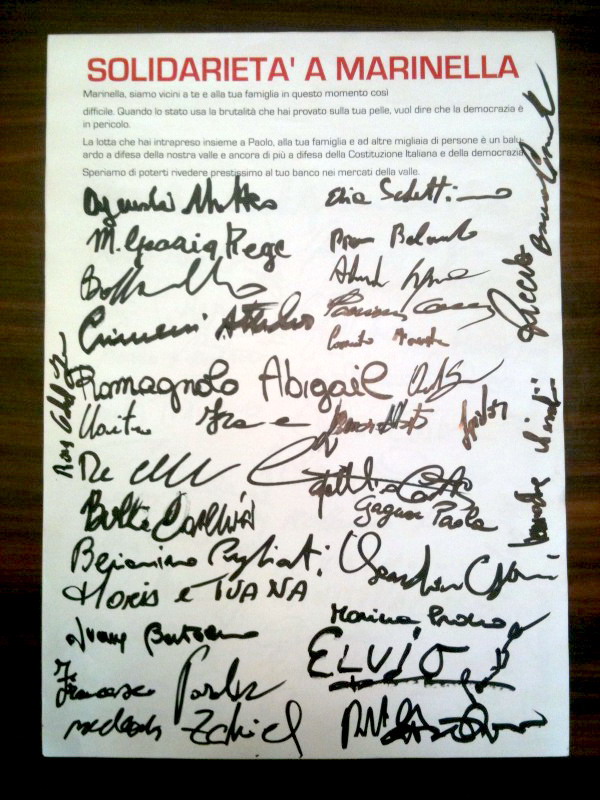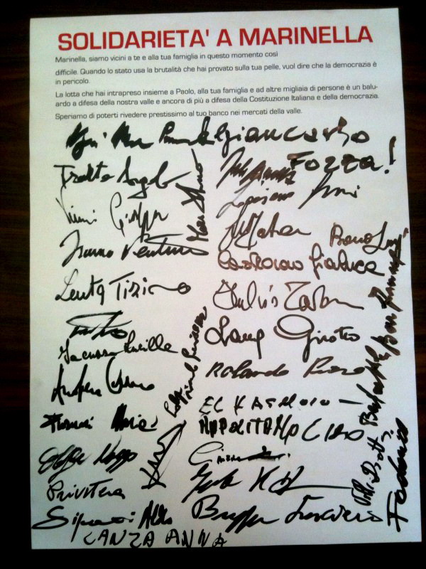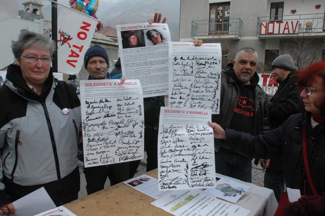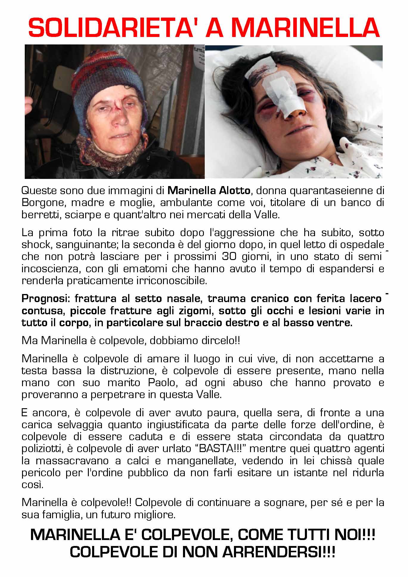 Marinella insieme al marito hanno un banco nei mercati della valle, sono conosciuti da tutti come ambulanti e come no tav. Da quando Marinella è all’ospedale amici e comitati, hanno presidiato il loro spazio nei mercati di Bussoleno, Condove e Borgone, con un banchetto informativo, la gigantografia di Marinella e una raccolta di firme in solidarietà con i feriti provocati dalle forze dell’ordine.