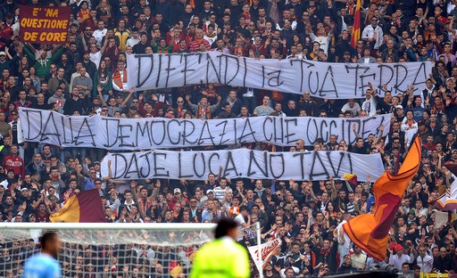 5/3_Infoaut.org -Ieri durante il derby Roma-Lazio dalla curva sud giallo-rossa si è alzato un striscione che portava la frase “Difendi la tua terra dalla democrazia che uccide – Daje Luca No tav“.Per chi ha dedicato parte della propria vita alle gradinate degli stadi dove la speculazione economica ha rovinato il gioco più bello del mondo, vedere quello striscione oggi fa sorridere di soddisfazione, perché anche lì, in quelle curve che per anni sono state la palestra della repressione, ieri si è tornato a gridare schierandosi dalla parte giusta. A differenza di quanto scrivono i pennivendoli si può essere ultras ed essere allo stesso tempo notav, si può essere notav e antagonista, si può essere di qualsiasi parte del mondo ed essere notav!