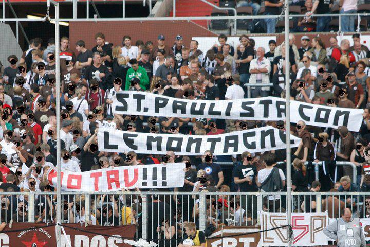 Nella seconda foto, la curva del St.Pauli (Amburgo) che ci aveva mandato insieme ad un comunicato (STRISCIONE NO TAV DEL ST. PAULI)