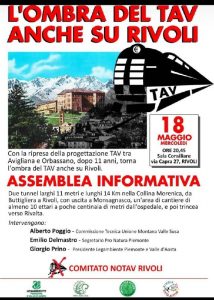 Siete quindi tutte e tutti invitati a partecipare all’Assemblea informativa No Tav, mercoledì 18 maggio, alle ore 20.45, nella Sala Consiliare di Rivoli (via Capra, 27).