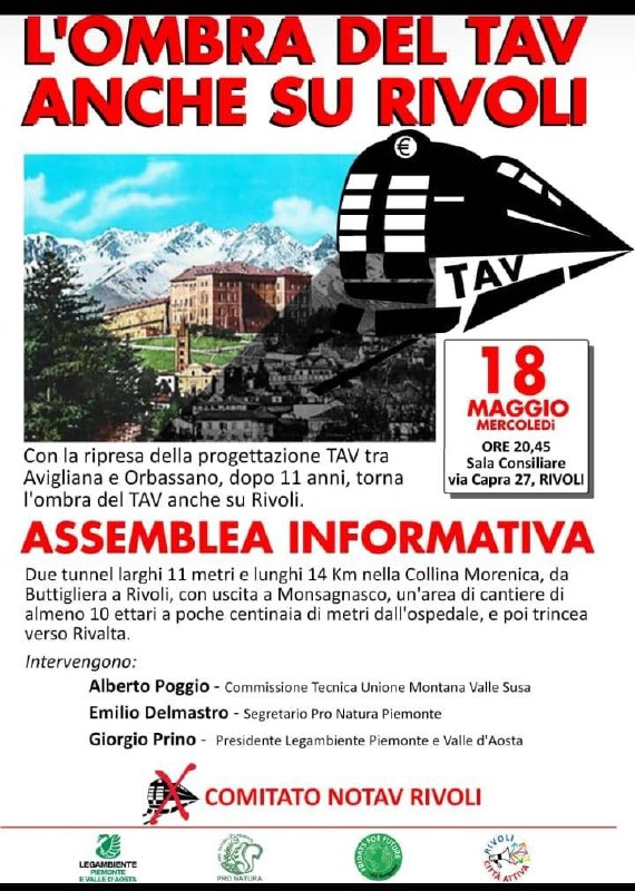 Mercoledì 18 maggio, alle ore 20.45, si terrà l’Assemblea informativa No Tav, nella Sala Consiliare di Rivoli, in via Capra 27. L’incontro è organizzato dal Comitato No Tav di Rivoli, Fridays for future Rivoli e Valsangone, ProNatura Piemonte e dal comitato Città Attiva.