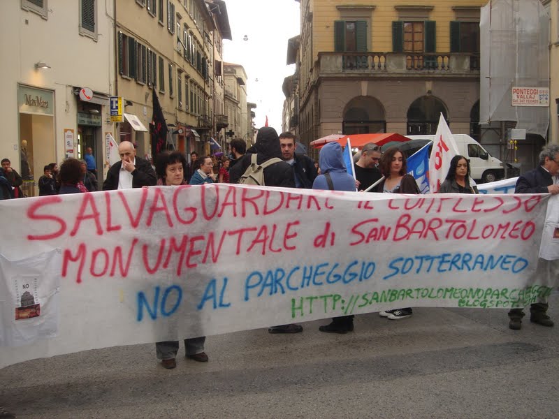 Il corteo è terminato in Piazza San Bartolomeo. Dove abita Antonio, tuttora agli arresti domiciliari, ma anche simbolo di una delle Lotte più importanti oggi a Pistoia: la battaglia contro un parcheggio sotterraneo che la Curia (sic!) proprietaria e una SPA di Napoli vorrebbero edificare in una zona verde bellissima, nonchè una delle ultime aree “a verde” rimasta nel Centro Storico della nostra città.
