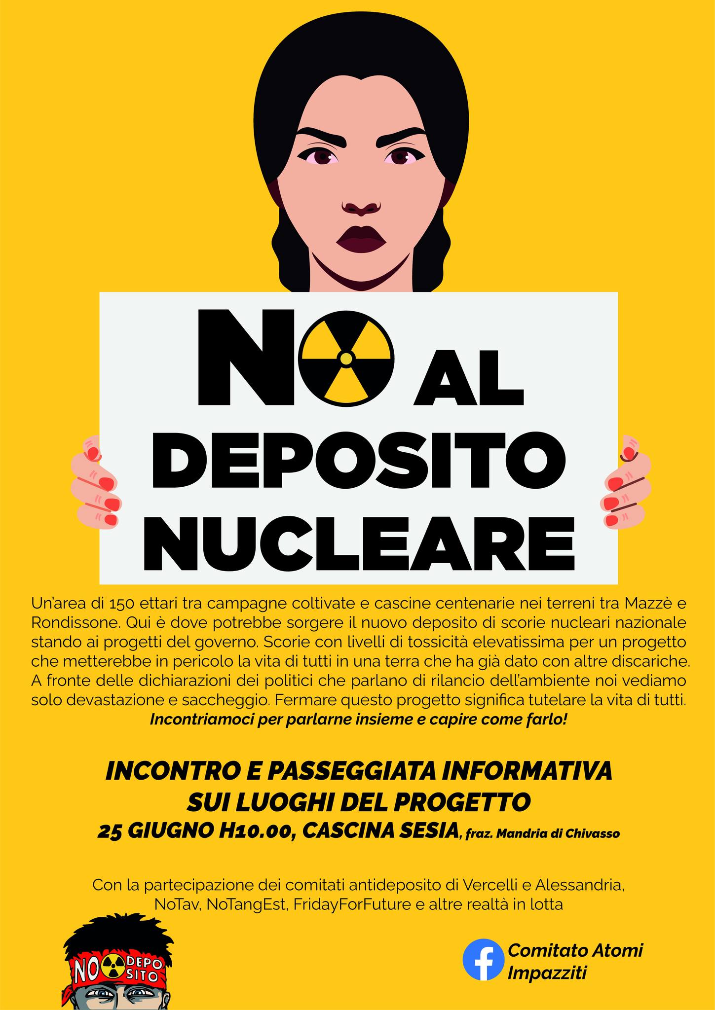 In questo disegno rientra il deposito nazionale nucleare che ovunque verrà costruito ruberà 150 ettari di terreno. Nel caso di Mazzé si tratta di un’area fatta di terreni coltivati e cascine centenarie. Il deposito ospiterà scorie di tutti i tipi e rappresenta un pericolo per la salute della popolazione, un enorme disagio per chi abita nei dintorni, un fattore di inquinamento ambientale ed un’opera inutile poiché sarà comunque una soluzione provvisoria in attesa del deposito europeo. Il deposito porterà con sè la militarizzazione del territorio ed in tempi di guerra non bisogna dimenticarsi che questo tipo di opere possono diventare obbiettivi militari. In un territorio come il nostro già pesantemente infrastrutturato non possiamo accettare questo ulteriore sacrificio.