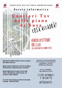 Venerdì 28 ottobre, dalle ore 21, vi aspettiamo presso la Sala Consiliare del Comune di Susa insieme ai tecnici dell’Unione Montana Luca Giunti e Roberto Vela, per parlare insieme dei futuri ed eventuali sviluppi che potrebbe portare l’opera di cantierizzazione Tav sul territorio del comune valsusino.