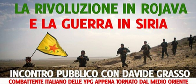 Un dibattito incontro con Davide, torinese,no tav, appena rientrato dal Kurdistan. Un incontro per ascoltare la voce di chi ha deciso di combattere contro il radicalismo islamico e per l’autodeterminazione del popolo curdo. Davide, militante no tav da sempre ci racconterà, dopo gli anni in val di Susa e a Torino, i cortei, i presidi e i processi, di questa nuova esperienza, la lotta in Kurdistan. Abbiamo seguito con entusiasmo i suoi report dettagliati e reali (veri a differenza delle falsità mainstream) dal fronte, ora avremo l’occasione di riaggiornarci dal vivo.